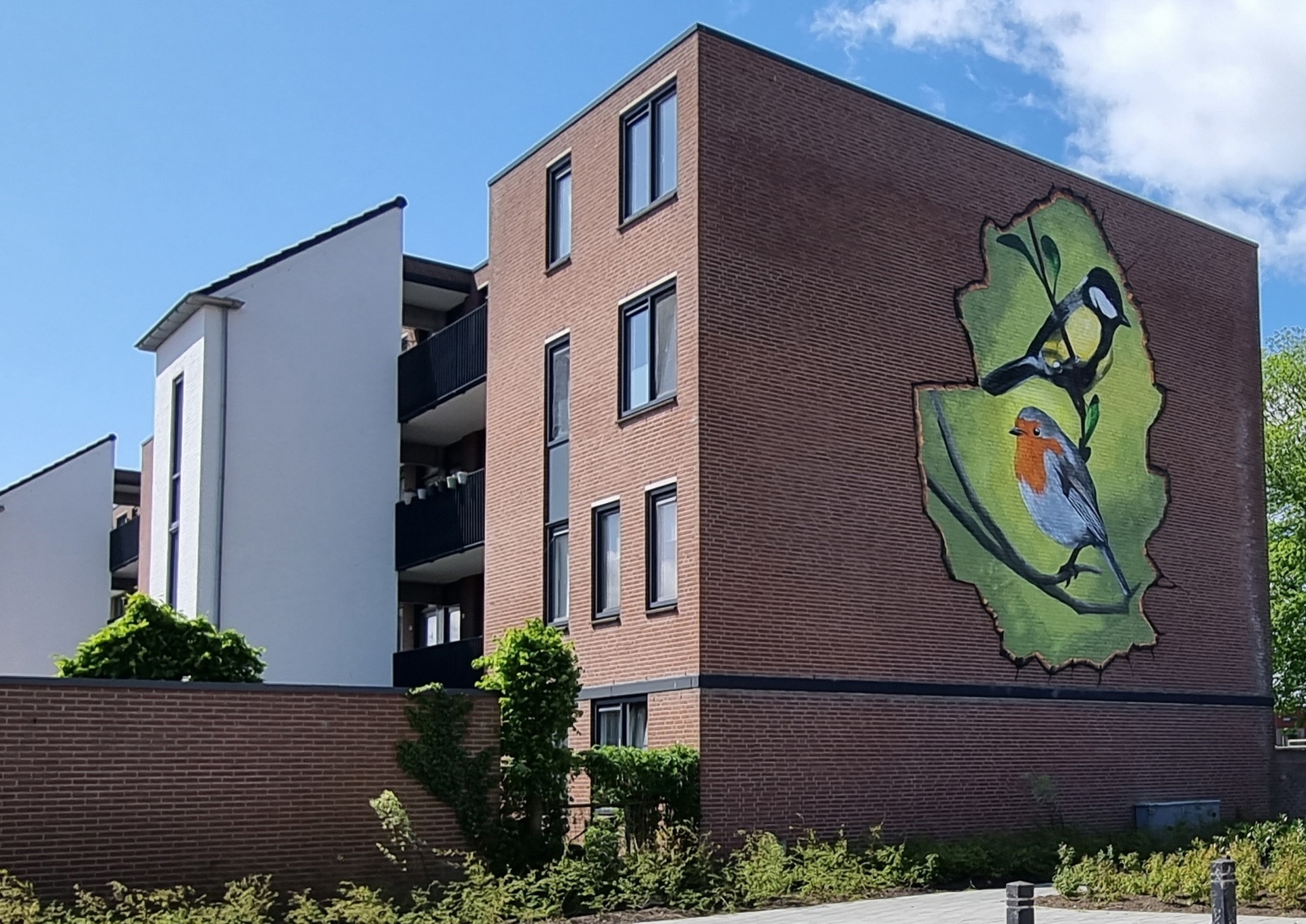 Een aantal bewoners hebben met de Beter Buurt Bijdrage van Centrada hun galerij opgefleurd met bloembakken. De bewoners met een tuin hebben deze mooi op orde gebracht en een aantal hebben zelfs een tuinabonnement afgesloten om het mooi te gaan houden. En ook de bovengrondse containers bij de ingang, die veel bewoners een doorn in het oog waren, zijn weggehaald. Iedereen is zeer blij met het resultaat van deze gezamenlijk opknapbeurt. Maar het kon nog mooier, vonden ze. Zo kwamen de bewoners zelf met het idee om de muur te verfraaien met een muurschildering. Tijdens een bewonersavond in de Windhoek hebben de bewoners hun wensen voor de muurschildering kunnen aangeven. Uiteindelijk is met elkaar gekozen voor deze kleurrijke afbeelding van een koolmeesje en een roodborstje.